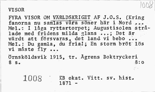//// outf //// VISOR //// FYRA VISOR OM VÄRLDSKRIGET AF J.O.S. (Kring fanorna nu samlas våra söner här i Nord Mel.: I låga ryttartorpet; Augustisolen strålade med fridens milda glans ...; Det är värdt att försvaras* det land vi bebo ... Mel-: Du gamla, du friai; En storm bröt lös vi måste fly ... //// Örnsköldsvik 1915, tr. Ågrens Boktryckeri 8 S-. 8:0 //// 100S ^B okat. Vitt. sv. hist* //// ' 1871 - ////