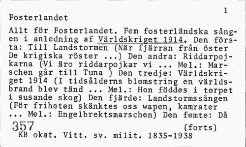 //// 1 //// Fosterlandet //// Allt för Fosterlandet. Fem fosterländska sången i anledning af Världskriget 1914. Den första: Till Landstormen (När fjärran från öster De krigiska röster ...) Den andra: Riddarpoj-karna (Vi äro riddarpojkar vi ... Mel.: Marschen går till Tuna ) Den tredje: Världskriget 1914 (I tidsålderns blomstring en världsbrand blev tänd ... Mel.: Hon föddes i torpet i susande skog) Den fjärde: Landstormssången (För friheten skänktes oss wapen, kamrater ... Mel.: Engelbrektsmarschen) Den femte: Då //// 357 (forts) //// KB okat. Vitt. sv. milit. 1835-1938 ////