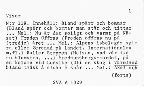 //// 1 //// Visor //// N:r 119. Innehåll: Bland spärr och bommar (Bland spärr och bommar man står och tittar ... Mel.: Nu är det soligt och varmt på Näset) Freden Offras (Freden offras nu på (tredje) året ... Mel.: Alpens isbelagda spira eller Serenad på landet. Internationalen m.fl.) Buller Steppen (Hejsan, vad vår tid nu blomstra, Fredmunsbergs-mordet, på //// en kolare vid Ludvika (Uti en skog i Värmland bland träsk å stubb å snår ... Mel.: S*xel och //// (forts) //// SVA A 1029 ////