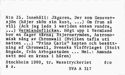 //// N:o 25. Innehåll: Jägaren. Der som Genever-sjön (höjer skön sin kust, ...) Om frun så vill (Ack jag leds i werlden ensam vandra* ..) Vermländsflickan. Högt upp i Vermland bor en fager tärna; Stjernerymden, Astronomisk sång av Chronwall (Hvilken tafla uti natten ..,) "Prins Carls" kapten och besättning af Chronwall, Svenska Visförlaget (Stolt ångade, från Arbogastaden ... Mel.: Amanda satt med en krans i håren) //// Stockholm 1900, tr. Wasatryckeriet 8:0 //// 8 s* SVA A 317 ////