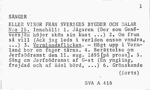 //// 2 //// SÅNGER //// ELLER VISOR FRÄN SVERIGES BYGDER OCH DALAR N:o 25, Innehåll: 1. Jägaren (Der som Gené-versjön höjer skön sin kust ...) 2. Om frun så vill (Ack jag leds i verlden ensam vandra, ...) 3. Ve rmlands flic kan. - Högt upp i Verm-land bor en fager tärna. 4. Berättelse om Jerfsödramat den 11. aug„ 1895 f^på prosa]. 5. Sång om Jerfsödramat af G-st (En yngling, frejdad och af ädel börd, ...) 6. Grönskande //// (forts) //// SVA A 691 ////