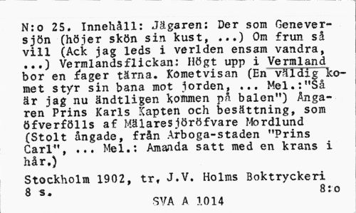 //// N:o 25. Innehåll: Jägaren: Der som Genever-sjön (höjer skön sin kust, ...) Om frun så vill (Ack jag leds i verlden ensam vandra, ...) Värmlandsflickan: Högt upp i Vermland bor en fager tärna. Kometvisan (En väldig ko-met st/r sin bana mot jorden, ... Mel.:"Så är jag nu ändtligen kommen på balen") Ångaren Prins Karls Kapten och besättning, som öfverfölls af MälareSjöröfvare ?4ordlund (Stolt ångade, från Arboga-staden "Prins Carl", ... Mel.: Amanda satt med en krans i hår.) //// Stockholm 1902, trf J.V. Holms Boktryckeri 8 s. 8:o //// sva a 1.014 ////