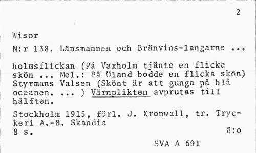 //// 2 //// Wisor //// N:r 138. Länsmannen och Bränvins-langarne . //// holmsflickan (På Vaxholm tjänte en flicka skön ... Mel.: På öland bodde en flicka skön) Styrmans Valsen (Skönt är att gunga på blå oceanen. ... ) Värnplikten avprutas till hälften. //// Stockholm 1915, förl. J. Kronwall, tr. Tryckeri A.-B. Skandia //// 8 s. 8:o //// SVA A 691 ////