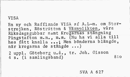 //// VISA //// En ny och Rafflande VISA af A.L-m. om Storstrejken, Rösträtten & Värnplikten, våra Riksdags gubbar samt Krogarnas stängning Pingstafton m.m., m.m. (Nu ha vi alla till hea fått knalla »..; Men bönderna blängde, när krogarna de stängde ...) //// 2 uppl. Göteborg u.å., tr. Joh. Olsson 4 s. (i samlingsband) 8**0 //// SVA A 9 421 ////