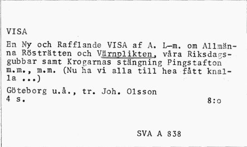 //// VISA //// En Ny och Rafflande VISA af A. L-m. om Allmänna Rösträtten och Värnplikten. våra Riksdagsgubbar samt Krogarnas stängning Pingstafton m.m., m.m. (Nu ha vi alla till hea fått knalla ...) //// Göteborg u.å., tr. Joh. Olsson 4 s. 8:0 //// SVA A 9 8 ////