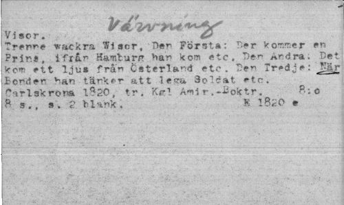 //// i. //// visor. & //// Twackra Wi der, D«r Första: !>r kommer en Print, ifr&r Hamtur/r bar kom etc, I>er A^dra. D«t kot ett ljus f rar C s ter Tand etc. T? er Tredje: K^y Bonden han tänker att lesu Soldat etc. Carlakrona 1$20, tr. K c-1 Anir .-JBoktr, B*.o //// B s., s. 2 blunk. K I8S0 e ////