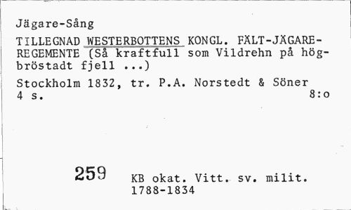 //// Jägare-Sång //// TILLEGNAD WESTERBOTTENS KONGL. FÄLT-JÄGAREREGEMENTE (Så kraftfull som Vildrehn på hög-bröstadt fjell ...) //// Stockholm 1832, tr. P.A. Norstedt & Söner 4 s. 8:0 //// 259 KB okat. Vitt. sv. milit. //// 1788-1834 ////