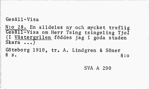 //// Gesäll-Visa //// N:o 28. En alldeles ny och mycket treflig Gesäll-Visa om Herr Tsing tsingeling Tjoi (I Väs tergyllen föddes jag I goda staden Skara ...) //// Göteborg 1910, tr. A. Lindgren & Söner 8 s. 8:o //// SVA A 290 ////