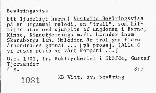 //// Beväringsvisa //// Ett ljudeligt hurra] Yesigäta Beväringsvisa på en urgammal melodi, en "trall", som hittills utan ord sjungits af ungdomen i Barne, Kinne, Kinnefjerdings m.fl. härader inom Skaraborgs län. Melodien är troligen flere århundrades gammal ... [på prosaj. (Alla ä vi raska pojka ve vårt kompani ...( //// U.o. 1901, tr. Boktryckeriet i Sköfde, Gustaf Tj orsander //// 4 s. 8:0 //// 1081 Vitt. sv. beväring ////
