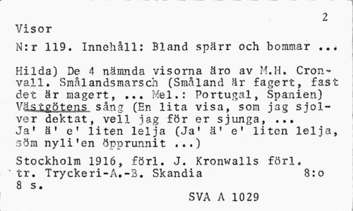 //// 2 //// Visor //// N:r 119. Innehåll: Bland spärr och bommar ... //// Kilda) De 4 nämnda visorna äro av M.H. Cron-vall. Smålandsmarsch (Småland är fagert, fast det är magert, ... Mel.: Portugal, Spanien) Västgötens sång (En lita visa, som jag sjol-ver dektat, veil iag för er sjunga, ... Ja' ä» e' liten lelja (Ja* ä' e1 liten lelja, söm nyli'en öpprunnit ...) //// Stockholm 1916, förl. J. Kronwalls förl. ' tr. Tryckeri-A.-3. Skandia 8:o //// 8 s //// SVA A 10 29 ////