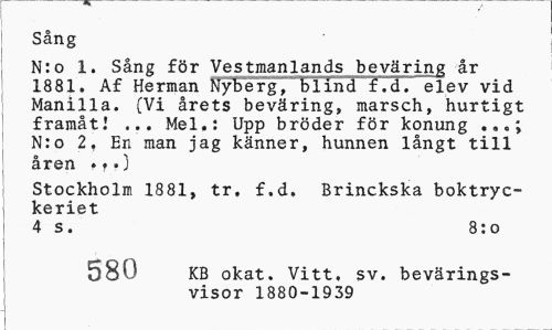 //// Sång //// N:o 1. Sång för Vestmanlands beväring år 1881. Af Herman Nyberg, blind f.d. elev vid Manilla. (Vi årets beväring, marsch, hurtigt framåt! ,., Mel,: Upp bröder för konung N:o 2. En man jag känner, hunnen långt till åren • ? •} //// Stockholm 1881, tr, f.d, Brinckska boktryckeriet //// 4 s. 8:o //// 580 KB okat. Vitt, sv. beväringsvisor 1880-1939 ////