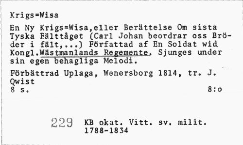 //// Krigs=Wisa //// En Ny Krigs=Wisa,eller Berättelse Om sista Tyska Fälttåget (Carl Johan beordrar oss Bröder i fält,...) Författad af En Soldat wid Kongl.Wästmanlands Regemente. Sjunges under sin egen behagliga Melodi. //// Förbättrad Uplaga, Wenersborg 1814, tr. J. Qwist //// 8 s. 8:0 //// 229 KB okat. Vitt. sv. milit. //// 1788-1834 //// I ////