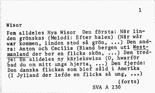 //// 1 //// Wisor //// Fem alldeles Nya Wisor Den första: När linden grönskas (Melodi: Efter balen) (När wår war kommen, linden stod så grön, ...) Den and-Ta: Anton och Cecilia (Bland bergen uti West-manland der bor en flicka skön, ...) Den tredje: lin alldeles ny kärlekswisa (0, hwarför bad du om mitt unga hjerta, ...) Den fjerde: Den danska flickan som blef såld i Amerika (I Jylland der lefde en flicka så ung, ...) //// (forts) //// SVA A 2 30 ////
