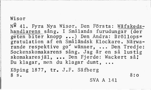 //// Wisor //// N^ 41. Fyra Nya Wisor. Den Första: Wäfskeds-handlarens sång. I Smålands furudungar (der geten biter knopp ...) Den Andra: Bröllops= gratulation af en Småländsk Klockare. Närwa-rande respektive go' wänner, ... Den Tredje: Sockenskomakarens sång. Jag är en så lustig skomakaresjäl, ... Den Fjerde: Wackert så] Du klagar, men du klagar dumt, ... //// Köping 1877, tr. J.F. Säfberg 8 s. 8:o //// SVA A 141 ////