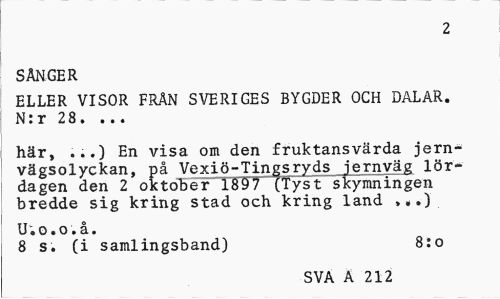 //// 2 //// SÅNGER //// ELLER VISOR FRÄN SVERIGES BYGDER OCH DALAR. N:r 28. ... //// här, ...) En visa om den fruktansvärda jern-vägsolyckan, på Vexiö-Tingsryds jernväg lördagen den 2 oktober 1897 (Tyst skymningen bredde sig kring stad och kring land ,..) //// U;o.o.å. //// 8 s. (i samlingsband) 8:o //// SVA A 212 ////