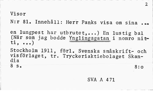 //// 2 //// Visor //// N:r 81. Innehåll: Herr Panks visa om sina . //// en lungpest har utbrutet,...) En lustig bal (När som jag bodde Ynglingagatan i nomro nit-ti j *..) //// Stockholm 1911, förl. Svenska småskrift- och visförlaget, tr. Tryckeriaktiebolaget Skandia //// 8 s. 8:o //// SVA A 4 71 ////