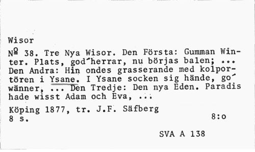 //// Wisor //// N- 38. Tre Nya Wisor. Den Första: Gumman Win-ter. Plats, godsherrar, nu börjas balen; ... Den Andra: Hin ondes grasserande med kolportören i Ysane. I Ysane socken sig hände, go" wänner, ... Den Tredje: Den nya Eden. Paradis hade wisst Adam och Eva, ... //// Köping 1877, tr. J.F. Säfberg 8 s. 8:o //// SVA A 138 ////