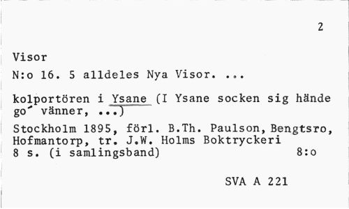 //// 2 //// Visor //// N:o 16. 5 alldeles Nya Visor. //// kolportören i Ysane (I Ysane socken sig hände go' vänner, ...) //// Stockholm 1895, förl. B.Th. Paulson, Bengtsro, Hofmantorp, tr. J.W. Holms Boktryckeri 8 s. (i samlingsband) 8:o //// SVA A 2 21 ////