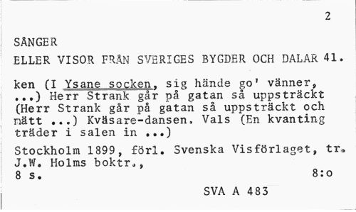 //// 2 //// SÅNGER //// ELLER VISOR FRÄN SVERIGES BYGDER OCH DALAR 41. //// ken (I Ysane socken, sig hände goJ vänner, ...) Herr Strank går på gatan så uppsträckt (Herr Strank går på gatan så uppsträckt och nätt ...) Kväsare-dansen, Vals (En kvanting träder i salen in ,..) //// Stockholm 1899, förl. Svenska Visförlaget, tr* J.W. Holms boktr„, //// 8 s. 8:o //// SVA A 483 ////