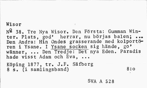//// Wisor //// N- 38. Tre Nya Wisor. Den Första: Gumman Win-ter. Plats, god* herrar, nu börjas balen; ... Den Andra: Hin Ondes grasserande med kolportören i Ysane. I Ysane socken sig hände, go* wänner, ... Den Tredje: Det nya Eden. Paradis hade visst Adam och Eva, ... //// Köping 1877, tr. J.F. Säfberg 8 s. (i samlingsband) 8:o //// SVA A 52 8 ////
