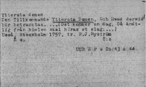 //// Yttersta domen //// Ten Tillkcrmande Y11gr s ta Domer., Csh Hwad derwid^ bör betr&cktas, . .."{UdT"fcoirunTr^en dag, .Då ändt-lig från himlen skal höras et slag;.,,) Uooå Stockholm 17^7» tr. P.J .%3tröM t a. 6:o //// UUB Z P * 26;43 & 44 ////