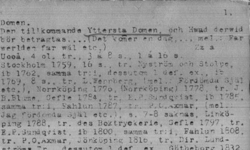 //// I W //// Öomsn. //// T>*n til' kommande Ytter» ta Domen. och Hwad i er wid bör betragtaa .. , . Verner "en"irig.. . , me7 . ; Far //// wérldee far wäl etc.) zz a //// Uooå, 4 ol. tr. , 3^6 s, , 1 a 16 a. Stockholm 1759, 16 a . tr. -Nyström b«Vn .St&Vge, ib 1762, samma tr: i, dessutom 1 def. ex., it //// 8 3. , . tr» L."Jernberg, i.^jel .: Fördömda 3 ' äj etc.,', Norrköping I T1?», (Norrköping) 177? tr." J . B .Bl ene . Oefle 1?S4# tr. I.. ? . nrf q'- i 3t „ ib l?3f. samma tr.: i, Fahlun 1./87, -tr. (.,..-ocraar * (mel. Jag ord' !*da 3J äl etc.), s. 7-8 saknas, Linköping 1788, tr. des Boktryekerie, Gefle 1797. tr. l.P.iundq/ist , ib lÖOO, samma tr;i, Fahlun i.S08, tr. H.O.AXmar, vönköping iSlo , tr. Dir. Land- ////