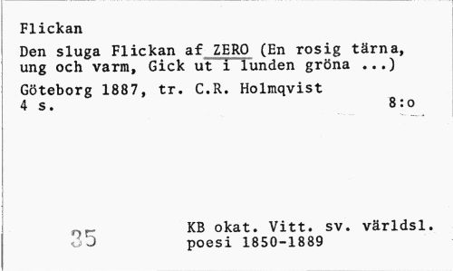 //// Flickan //// Den sluga Flickan af ZERO (En rosig tärna, ung och varm, Gick ut i lunden gröna ...) //// Göteborg 1887, tr. C.R. Holmqvist 4 s. 8:0 //// KB okat. Vitt. sv. världsl. uJ poesi 1850-1889 ////