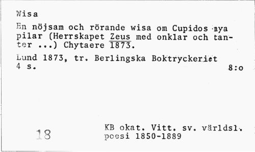 //// Wisa //// En nöjsam och rörande wisa om Cupidos -nya pilar (Herrskapet Zeus med onklar och tanter ...) Chytaere 1873. //// Lund 18 73, tr. Berlingska Boktryckeriet 4 s. 8:o //// KB okat. Vitt. sv. världsl-. 18 poesi 1850-1889 ////