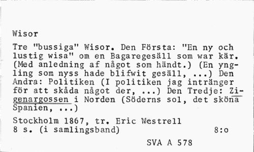 //// Wisor //// Tre "bussiga" Wisor. Den Första: "En ny och lustig wisa" om en Bagaregesäll som war kär. (Med anledning af något som händt.) (En yngling som nyss hade blifwit gesäll, ...) Den Andra: Politiken (I politiken jag intränger för att skåda något der, ...) Den Tredje: Zi-genargossen i Norden (Söderns sol, det sköna Spanien, ...) //// Stockholm 1867, tr. Eric Westrell 8 s. (i samlingsband) 8:0 //// SVA A 5 78 ////