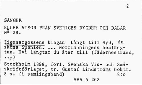 //// 2 //// sånger //// ELLER VISOR FRÄN SVERIGES BYGDER OCH DALAR N§ 39. //// Zigenargossens klagan Långt till Syd, du sköna Spanien. ... Norrlänningens hemlängtan. Hvi längtar du åter till (fädernestrand, ...) //// Stockholm 1898, förl. Svenska Vis- och Småskriftförlaget, tr. Gustaf Lindströms boktr. 8 s. (i samlingsband) 8:o //// SVA A 268 ////