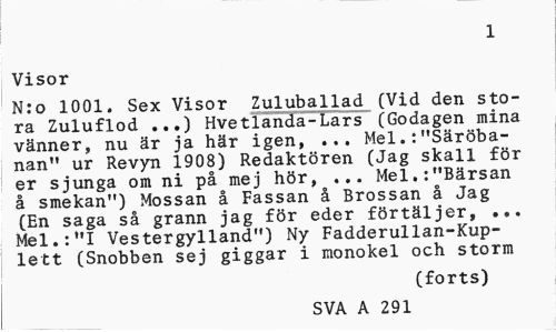 //// i //// i 1 //// Visor //// N:o 1001. Sex Visor Zuluballad (Vid den stora Zuluflod ...) Hvetlanda-Lars (Godagen mina vänner, nu är ja här igen, ... Mel.:"Säröba-nan" ur Revyn 1908) Redaktören (Jag skall för er sjunga om ni på mej hör, ... Mel.:"Bärsan å smekan") Mossan å Fassan å Brossan å Jag (En saga så grann jag för eder förtäljer, ... Mel.:"I Vestergylland") Ny Fadderullan-Kuplett (Snobben sej giggar i monokel och storm //// (forts) //// SVA A 291 ////