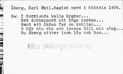 //// i Åberg, Karl Emil.Begick mord i Nikkala 1906. //// ¦ Se: I Norrlands kalla bygder... //// = Ett dubbelmord uti höga norden... //// - Sent ett åkdon far om kvällen... //// q 0 hör min vän och lyssna till min sång... //// ¦ Nu Åberg sitter inom lås och bom... //// | KB:S skillingtrycksreg. //// I ////