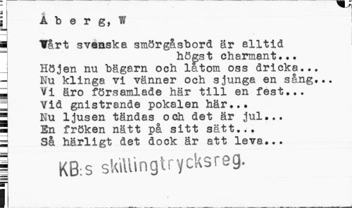//// i A b e r g, W //// ¦ Tårt svaaska smörgåsbord är alltid //// högst charmant... Höjen nu bägern och latom oss dricka... Nu klinga vi vänner och sjunga en sång... ä Vi äro församlade här till en fest... r Vid gnistrande pokalen här... //// ¦ Nu ljusen tändas och det är jul... //// ¦ En fröken nätt på sitt sätt... //// 1 Så härligt det dock är att leva... //// j KB:s skillingtrycksreg. //// I ////