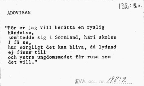 //// rsariiv. //// ÅDÖVISAN //// "För er jag vill berätta en ryslig händelse, //// som tedde sig i Sörmland, häri skolen I få se, //// hur sorgligt det kan bliva, då lydnad ej finns till //// och ystra ungdomsmodet får rusa som det vill." //// £YA gcc. nr... ////
