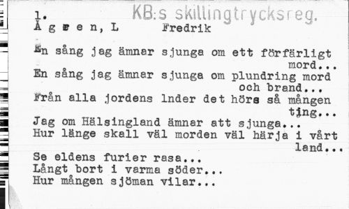 //// i. KB:S swllingtrycKsreg. //// Ll Å g b e n, L Fredrik //// - Jän sång jag ämnar sjunga om ett förfärligt //// mord... //// H En sång jag ämnar sjunga om plundring mord z! och brand... //// S Från alla jordens lnder det höra så mången g ting... //// m Jag om Hälsingland ämnar att sjunga... //// 5 Hur länge skall väl morden väl härja i vårt 2 land... //// * Se eldens furier rasa... //// g Långt bort i varma söder... //// S Hur mången sjöman vilar... //// I ////
