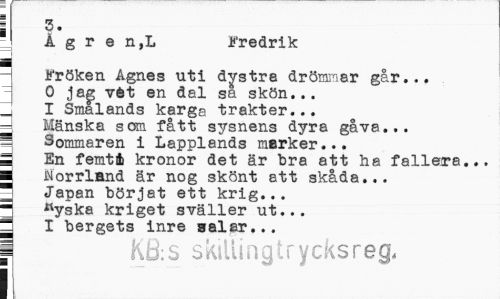 //// I //// A g r e n,L Fredrik //// Fröken Agnes uti dystra dröm ar går... //// - O jag vet en äal sa skön... I Smalands karge trakter... //// _ Mänska som fått sysnens dyra gåva... //// i Sommaren i Lapplands marker... //// i En femtfl) kronor det är bra att ha fallera... //// i Norrland är nog skönt att skåda... //// " Japan börjat ett krig... //// - "yska kriget sväller ut... " I bergets inre »alar... //// I KB:S skillingtrycksreg, //// I ////