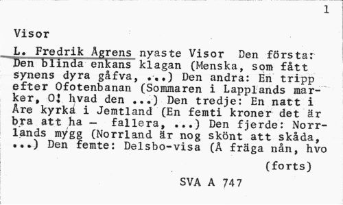 //// 1 //// Visor //// Fredrik Ågrens nyaste Visor Den första: Den blinda énkans klagan (Menska, som fått synens dyra gåfva, .,.) Den andra: En tripp efter Ofotenbanan (Sommaren i Lapplands marker, OJ hvad den ...-) Den tredje: En natt i Åre kyrkä i Jemtland (En femti kröner det är bra att ha - fallera, ...) Den fjerde: Norrlands mygg (Norrland är nog skönt att skåda, ...) Den femte: Delsbo-visa (Ä fräga nån, hvo //// (forts) //// SVA A 74 7 ////