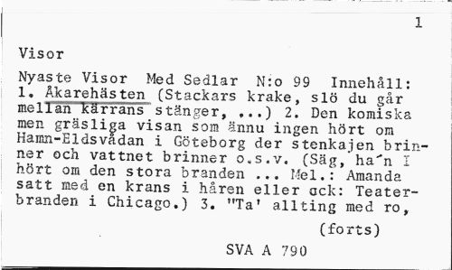 //// 1 //// Visor //// Nyaste Visor Med Sedlar Nio 99 Innehåll: 1, Äkarehästen (Stackars krake, slö du går mellan kärrans stänger, ,..) 2. Den komiska men gräsliga visan som ännu ingen hört om Hamn-Eldsvådan i Göteborg der stenkajen brinner och vattnet brinner o.s.v. (Säg, ha"n I hört om den stora branden ... Mel.: Amanda satt med en krans i håren eller ack: Teaterbranden i Chicago.) 3. "Ta' allting med ro, //// (forts) //// SVA A 790 ////