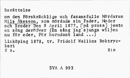 //// Berättelse //// om den Förskräcklige och fasansfulle Mördaren Nils Åkesson, som mördade sin Fader, Moder och Broder Den 9 April 1877, fpå prosa] jemte en sång deröfwer (En sång jag"sjunga wiljen nu för eder, För hurudant land ...) //// Linköping 1878, tr. Fridolf Wallins Boktryckeri //// 8 s. 8: o //// SVA A 955 ////