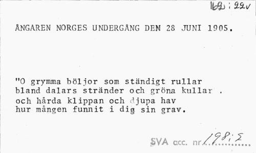 //// ÄNGAREN NORGES UNDERGÅNG DEM 28 JUNI 1905. //// "O grymma böljor som ständigt rullar bland dalars stränder och gröna kullar . och hårda klippan och djupa hav hur mången funnit i dig sin grav. //// jöVA ccc. nr ////