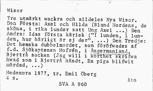 //// Wisor //// Tre utmärkt wackra och alldeles Nya Wisor. Den Första: Axel och Hilda (Bland Nordens, de sköna, i rika lunder satt Ung Axel ...) Den Andra: Idas första kärlek ("I lunden, i lunden, hur härligt är ej der", ...) Den Tredje: Det hemska dubbelmordet, som föröfwades af f.d. Sjökaptenen Hofrén, i Ångermanland, Bjertrå socken (Jag will i korthet skrifwa hwad som i Bjertrå händt, En piga blifwit mördad, ...) //// Hedemora 1877, tr. Emil Öberg 4 s. 8:0 //// SVA A 960 ////