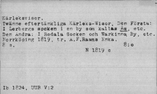 //// Kärleksvisor. //// Twänne eftertänkliga Kärieks-Wisor, Den Förata: I Lerbergs socken i en by som kallas Ajb, etc. Den ^ndra: I Rodala Socken och Warkinna. By, etc. Korrköoing 1819, tr, A.F.Raams Enka. 8 9. 8: o //// N 1819 c //// Ib 1824, UUB V: 2 ////
