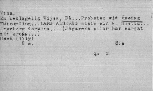 //// Vi aa. //// En bekla^elig Wijsa, Då.,. „Prob3ten n id As ed a g Församling.. ,L*R3 AL5ERU3 miste sin k, trTsTruT . . Ingeborg Korwina,.,.(JÄgarens pilar har sargat Bin kropp..,) //// Jooå (1719) //// 8 s, 8:o //// ¦q,z 2 ////