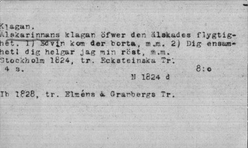 //// Cl agan. //// älskarinnans klagan öfwer den älskades flygtig-. //// iJ"Sdvir kom der borta, mjn. 2) Dig ensara-letl dig helgar jag wjin roat, tt.m. jtockholis 1824, tr. JKcksteinaka ?r'. 4 s. 8; o //// N 1624 d //// [b 1828, tr. Bl-néns 4 Granbergs Tr, ////