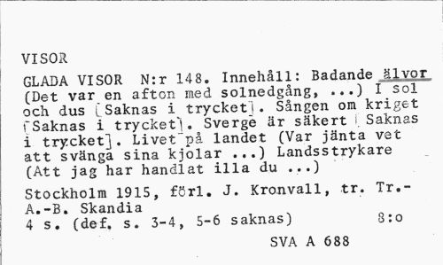//// VISOR //// GLADA VISOR N:r 148. Innehåll: Badande älvor (Det var en afton med solnedgång, ...) I sol och dus [Saknas i trycket]. Sången om kriget fSaknas i trycket]. Sverge är säkert i. Saknas i trycket]. Livet på landet (Var jänta vet att svänga sina kjolar ...) Landsstrykare (Att jag har handlat illa du ...) //// Stockholm 1915, förl. J. Kronvall, tr. Tr.-A.-B. Skandia //// 4 s. (def, s. 3-4, 5-6 saknas) 3:o //// SVA A 9 688 ////