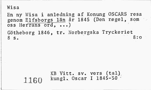 //// Wisa //// En ny Wisa i anledning af Konung OSCARS resa genom Elfsborgs län år 1845 (Den regel, som oss Herrans ord, ...) //// Götheborg 1846, tr. Norbergska Tryckeriet 8 s. 8:o //// KB Vitt. sv. vers (tal) J kungl. Oscar I 1845-50 - ////