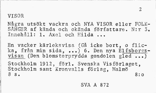 //// 2 //// VISOR //// Några utsökt vackra och NYA VISOR eller FOLKSÅNGER af kända och okända författare. N:r 3. Innehåll: 1. Axel och Kilda ... //// En vacker kärleksvisa (Gå icke bort, o flicka, från min sida, ...) 6. Den nya Elfsborgs-visan (Den blomsterprydda gondolen gled ...) //// Stockholm 1912, förl. Svenska Visförlaget, Stockholm samt Kronvalls förlag, Malmö 8 s. 8:o //// SVA A 8 72 ////