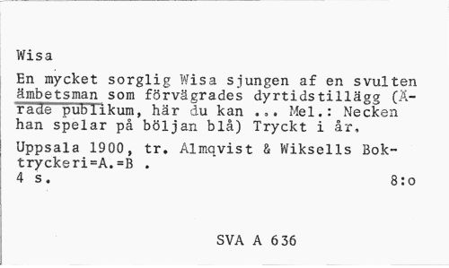 //// Wisa //// En mycket sorglig Wisa sjungen af en svulten ämbetsman som förvägrades dyrtids tillägg (Ä-rade publikum, här du kan ... Mel.: Necken han spelar på böljan blå) Tryckt i år, //// Uppsala 1900, tr. Almqvist & Wiksells Bok-tryckeri=A.=B . //// 4 s. 8:0 //// SVA A 6 36 ////