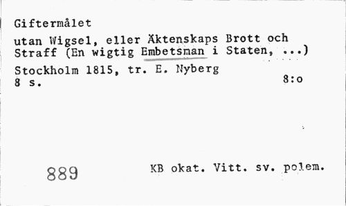 //// Giftermålet //// utan Wigsel, eller Äktenskaps Brott och Straff (En wigtig Embetsman i Staten, ...) //// Stockholm 1815, tr. E. Nyberg 8 s. 8:0 //// g gg KB okat. Vitt. sv. polem. ////