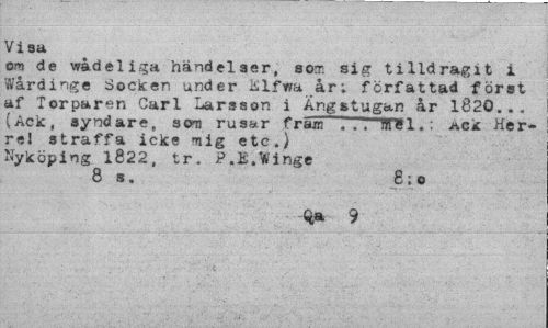 //// Visa //// om de wådeliga händelser, som sig tilldragit i Wårdinge Socken under Klftra år; författad först af Torparen Carl Larsson i Ang stugan år 1820.., (Ack, syndare, sot rusar frää fRSl.: -ack Her- //// rel straffa icke mig etc.) Nyköping 1822, tr. F.E,Vinge //// 8 s. 8;o //// qa 9 ////